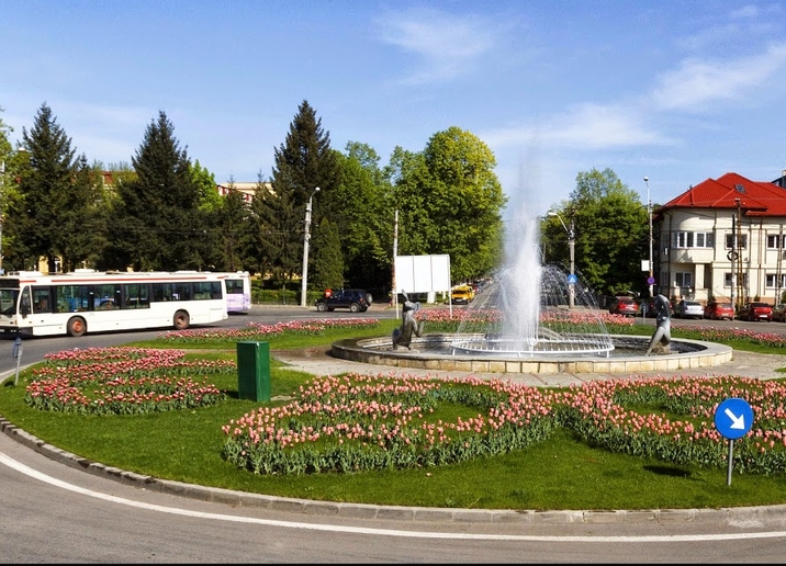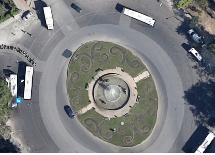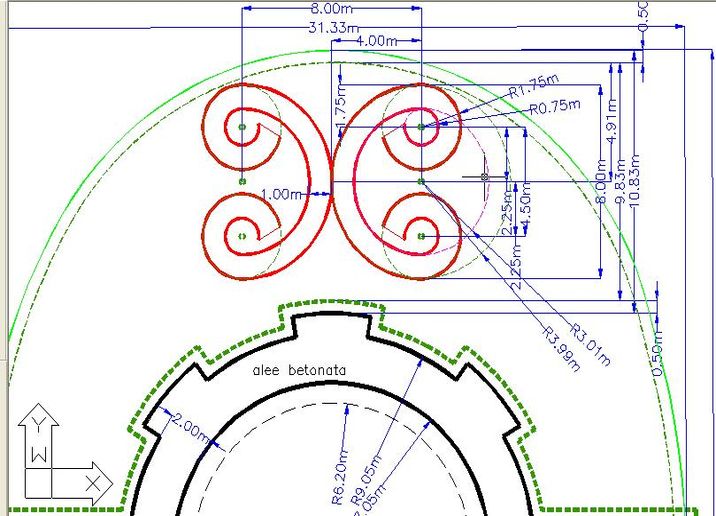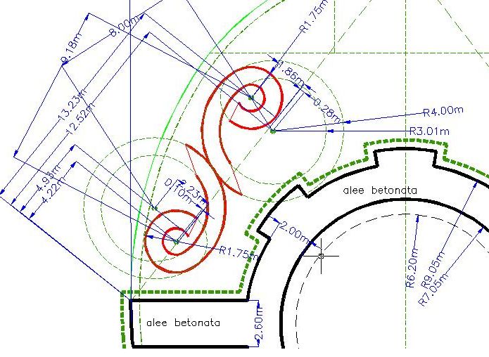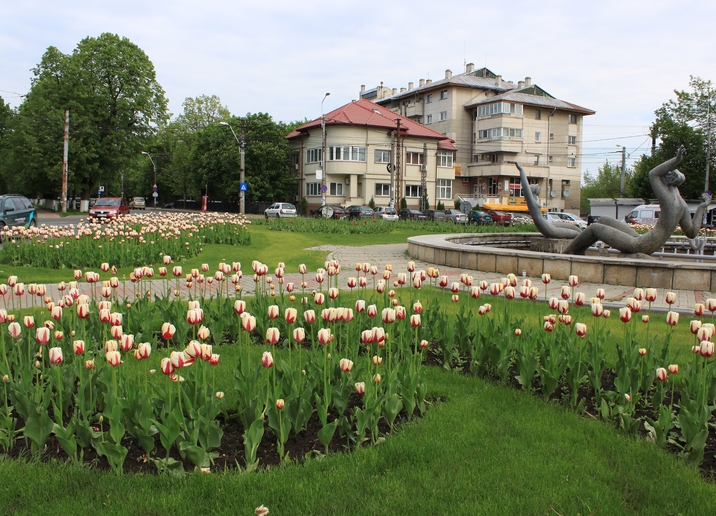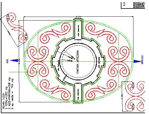 Desenul creat a urmărit realizarea unei proporţii juste a elementelor de ansamblu şi a detaliilor faţă de elementul dominant - fântâna arteziană. Astfel, desenul proiectat se subordonează centrului compoziţional; axele de perspectivă sunt largi, conform cu stilul adoptat al compoziţiei, aceasta rezolvând problema amenajării spaţiului, creând o vizibilitate maximă a participanţilor la trafic. Gazonul constituie un element de bază în amenajarea spaţiului, întregul desenul fiind proiectat pe o peluză ce constituie una din principalele frumuseţi ale amenajării pe care se profilează, într-un contrast puternic, jocul de culori şi forme. Îmbinarea culorilor şi nuanţelor materilalului dendrofloricol folosit în amenajare s-a făcut ţinând cont de fondul verde al peluzei. Gazonul reprezintă o parte integrantă a peisajului creat, oferind beneficii funcţionale, terapeutice, estetice şi de agrement.