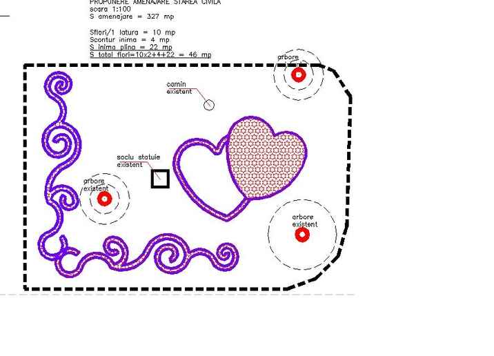 Desenul creat a urmărit vegetaţia şi statuia existente pe terenul de amenajat, cu riscul de a limita perspectivele.